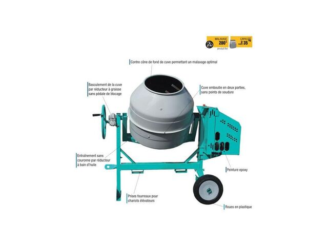 La bétonnière peut accueillir une capacité de malaxage de 2 sacs de 35 kg selon le dosage du béton.
